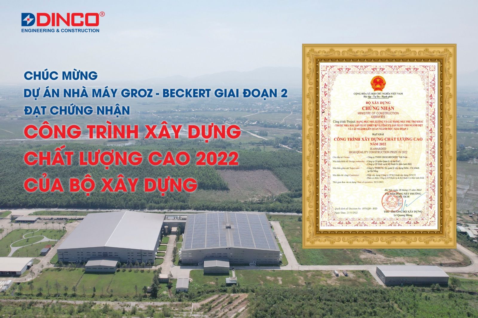 Ngày 30/11, tại Bộ Xây dựng, Ông Hồ Trung Dũng - Phó Tổng Giám đốc - Công ty Cổ phần Kỹ thuật & Xây dựng DINCO đã vinh dự được trao Chứng nhận CÔNG TRÌNH CHẤT LƯỢNG CAO năm 2022 cho dự án Nhà máy Groz - Beckert Giai đoạn 2 (Đức). Giải thưởng về chất lượng công trình xây dựng này là phần thưởng ghi nhận sự chuyên nghiệp phục vụ của DINCO E&C với vai trò tổng thầu thiết kế và thi công cho nhà máy. Đây là kết quả đáng tự hào cho sự nỗ lực của người DINCO.