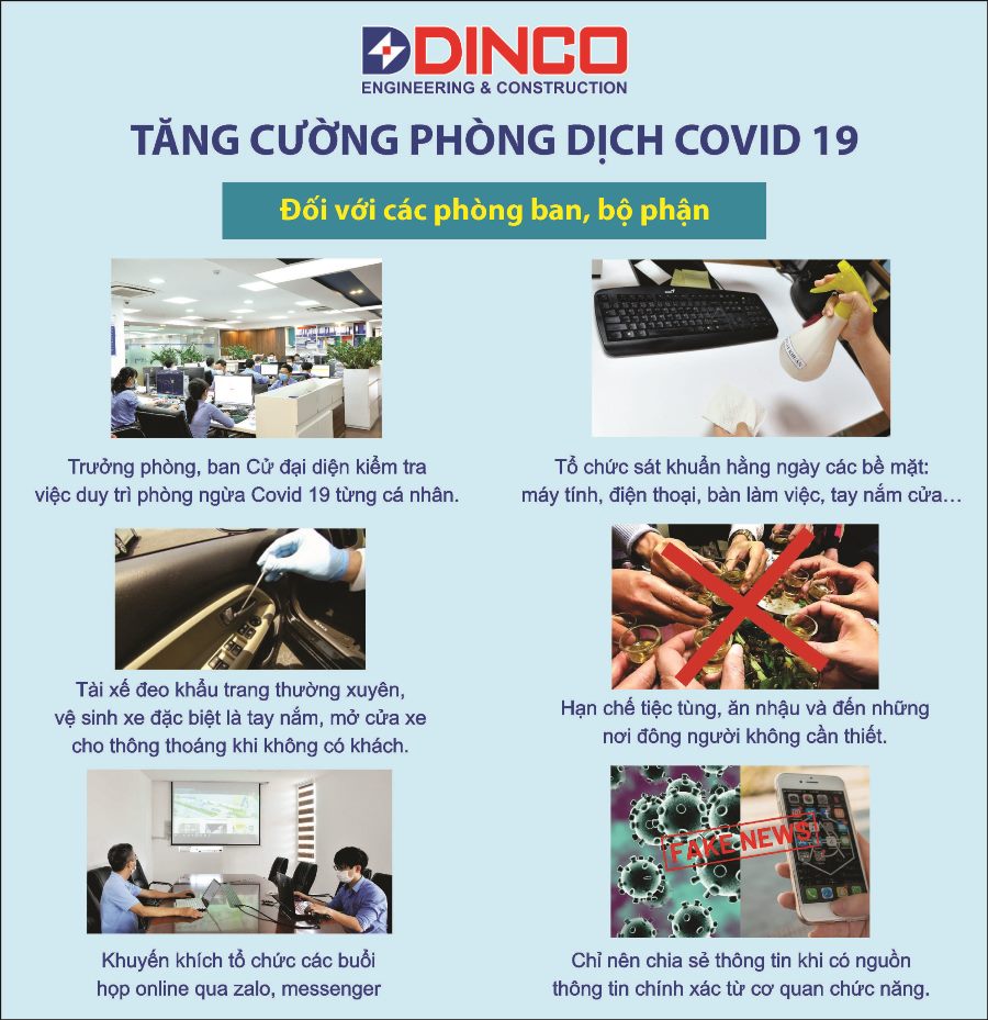 Từ khi nhận được thông tin về sự nguy hiểm của dịch Covid-19, ngay từ 30.01.2020 (mùng 6 tết) – ngày đầu tiên đi làm lại của CBNV công ty, DINCO E&C đã triển khai các công tác phòng chống dịch bệnh từ văn phòng đến tất cả các công trình do DINCO E&C làm tổng thầu.