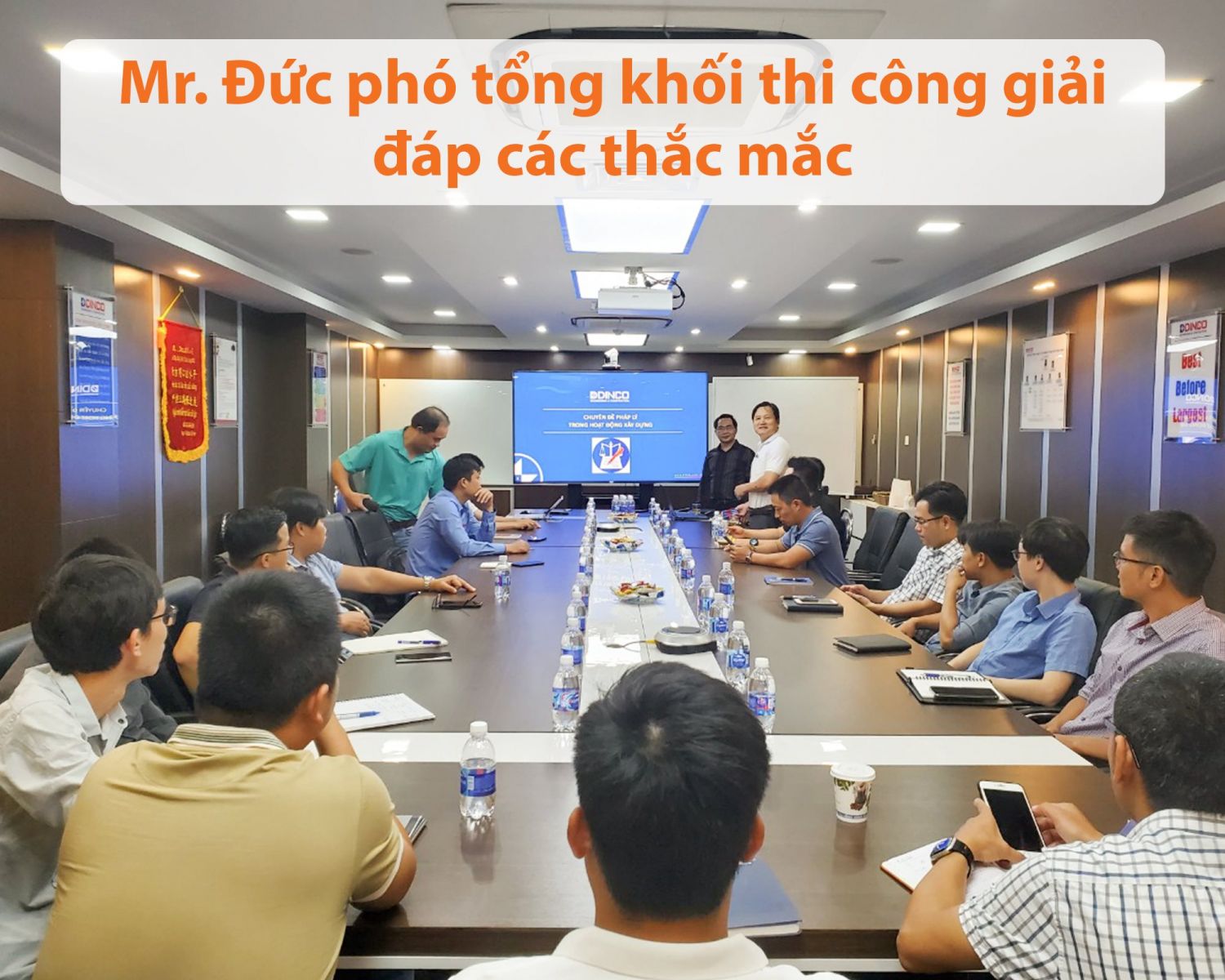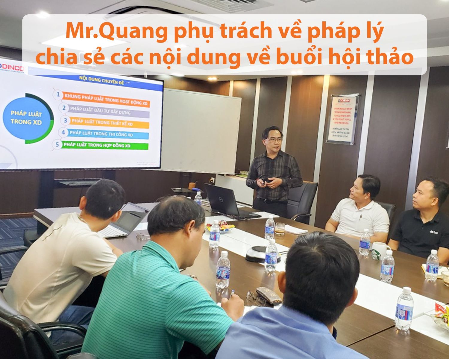 Mọi ngành nghề kinh doanh, mọi hoạt động trong đời sống của chúng ta đều được chi phối bởi hệ thống pháp luật. Nằm trong chương trình đào tạo bồi dưỡng nâng cao kiến thức cho đội ngũ nhân viên, sáng ngày 3/4/2021 Dinco E&C đã tổ chức buổi hội thảo “Pháp luật trong hoạt động xây dựng” với các đề tài như khung pháp luật trong xây dựng, pháp luật trong thiết kế xây dựng, pháp luật trong thi công xây dựng … Ngoài kiến thức pháp lý cụ thể trong công việc, các thành viên còn được trang bị thêm kiến thức để tăng tự tin khi nói chuyện với đối tác về pháp luật trong xây dựng.